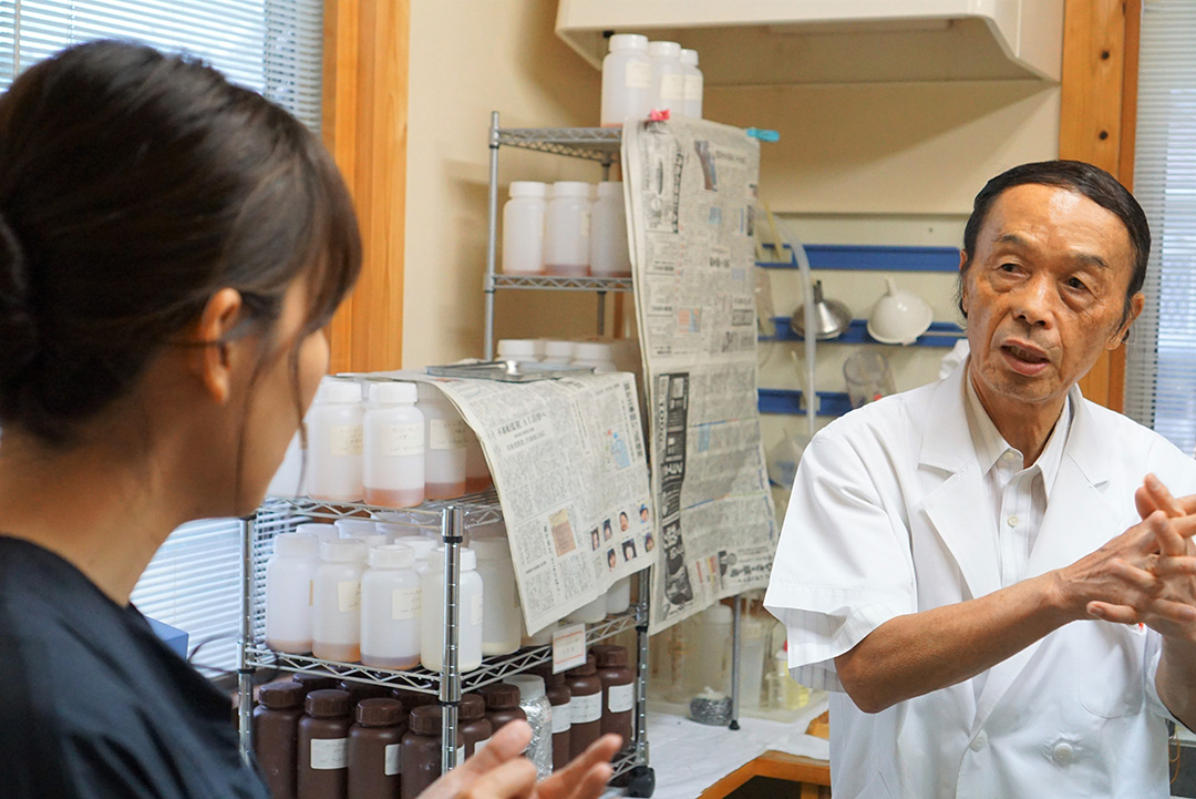 もともと、東かがわに本社を置く医薬品・外用製剤メーカーの研究者だった岩倉ドクター。体に貼る湿布(業界ではパップ剤と呼びます)分野において、世界で初めて温感タイプや、鎮痛作用タイプを開発したパイオニアメーカーであり、今や世界シェアを有する東かがわが誇る製剤メーカーで、まさにパップ剤の開発に携わり、さまざまな商品を世に生み出してきた研究者の一人です。30年前に同メーカーを退職され、今は15年前に立ち上げられた日本健康科学研究センターの所長を務められています。